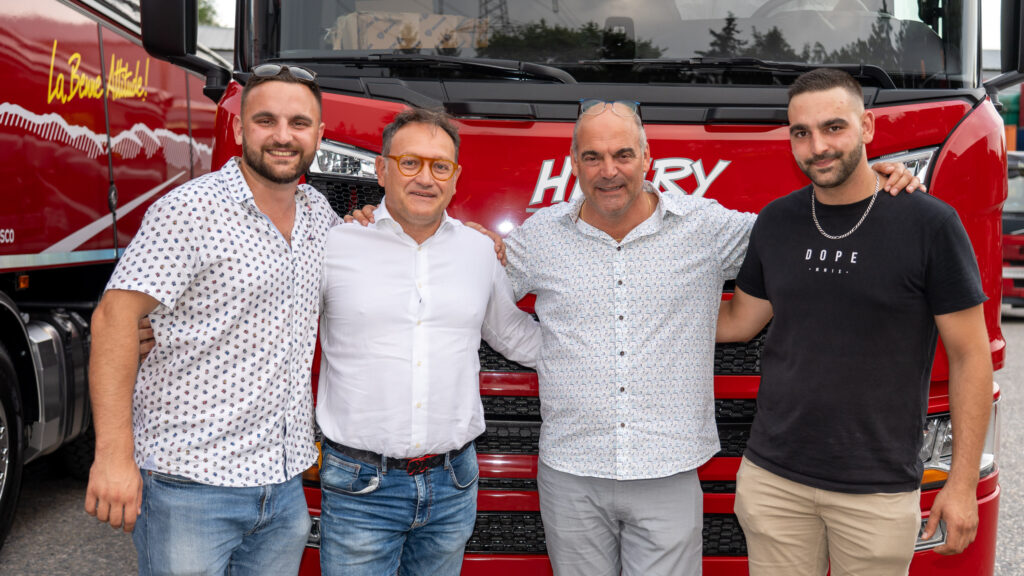 V.l.n.r.: Bastien, Claude Matthey (Grossvater von Bastien & Maxime Henry und ehemaliger Geschäftsführer von Matthey Petit SA), Maxime und Blaise Henry. (Beitragsbild: Scania Schweiz)