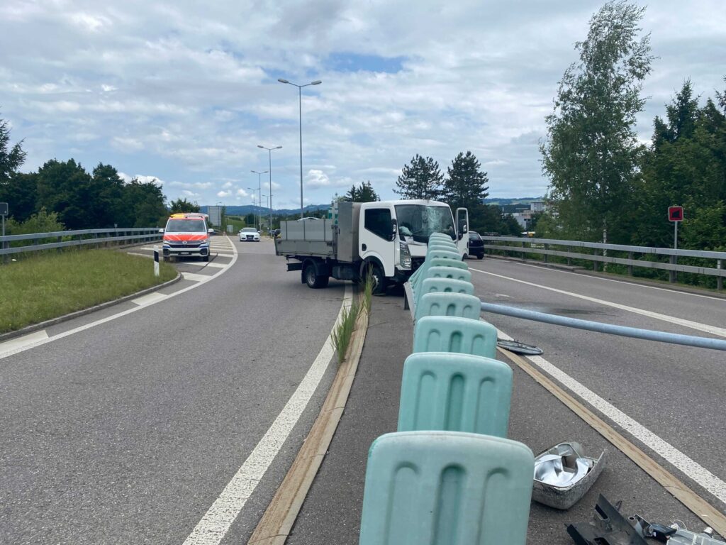 Ein Lieferwagen ist auf die Leiteinrichtung geraten und mit einem Kandelaber kollidiert.