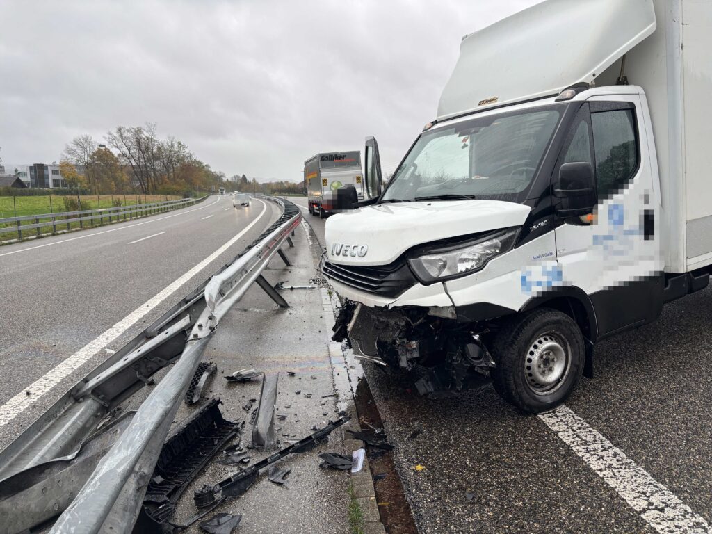Ein Lieferwagen kam am Montag bei Strengelbach von der Fahrbahn ab und kollidierte zweimal mit der Leitplanke. Mutmasslich führten Aquaplaning oder eine Windböe zum Unfall. Dabei wurde eine Person verletzt.