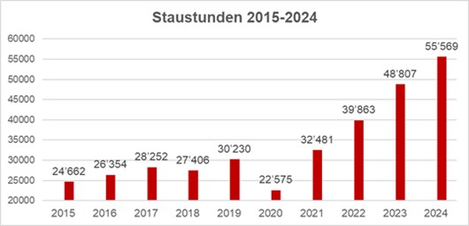 Die Stauproblematik beschäftigt uns weiterhin täglich und führt zu einem weiter steigenden Effizienzverlust. Die Staustunden haben 2024 im Vergleich zum Vorjahr um 13.9%, auf einen neuen Höchststand von 55‘569 Stunden, zugenommen. Der Stauzuschlag für das Jahr 2026 wird gemäss dem bestehenden Stauindex Felix neu 8.4% betragen. Insbesondere in der Region Basel sind die Staus seit dem Start der notwendigen Sanierungsarbeiten an der Schwarzwaldbrücke weiter angestiegen. Leider hat sich die Situation auch auf anderen wichtigen Strecken rund um Zürich, Genf sowie bspw. auf dem Abschnitt Oensingen – Bern nicht verbessert. Auf Grund der verlorenen Abstimmung über den Ausbau der Nationalstrassen im letzten Jahr besteht keine Hoffnung auf eine mittelfristige Verbesserung der gegenwärtigen Situation.
