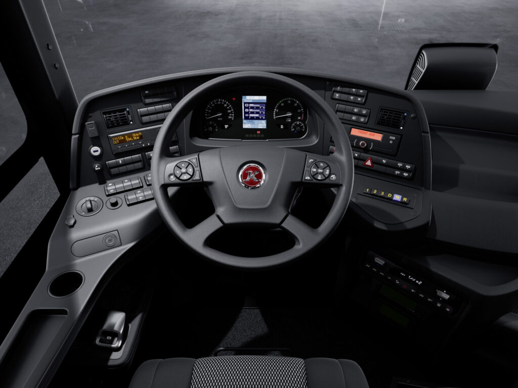 Der Fahrerplatz ist ergonomisch perfekt und fahrerbetont ausgeführt. Die Basis dafür waren unter anderem umfangreiche Ergonomie-Studien mit Testpersonen unterschiedlicher Größe und VR-Brille. Von seiner Optik über die Bedienungselemente bis zur Instrumentierung mit großen Rundinstrumenten und einem mittig angeordneten Farbdisplay erreicht das hochwertige Cockpit sogar vollwertiges Reisebus-Niveau. Zusammen mit dem serienmäßigen Multifunktionslenkrad bedeutet dies eine deutliche Aufwertung im Vergleich zu herkömmlichen Überlandbussen.