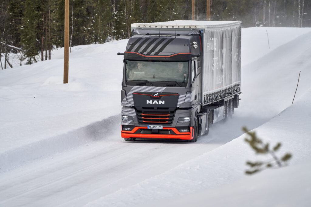 Von Dezember bis März integrierte MAN den kommenden Großserien-E-Lkw in seine jährliche Wintererprobung in Nord-Schweden. Dort bewies der für Tagesreichweiten zwischen 600 und 800 Kilometern taugliche MAN eTruck, dass er auch bei Eis, Schnee und Temperaturen bis zu minus 40 Grad problemlos funktioniert. Fahrfunktionen und Reichweite, Klimatisierung und Ladeverhalten standen auf Tausenden erfolgreichen elektrischen Testkilometern unter arktischen Bedingungen im Fokus.
