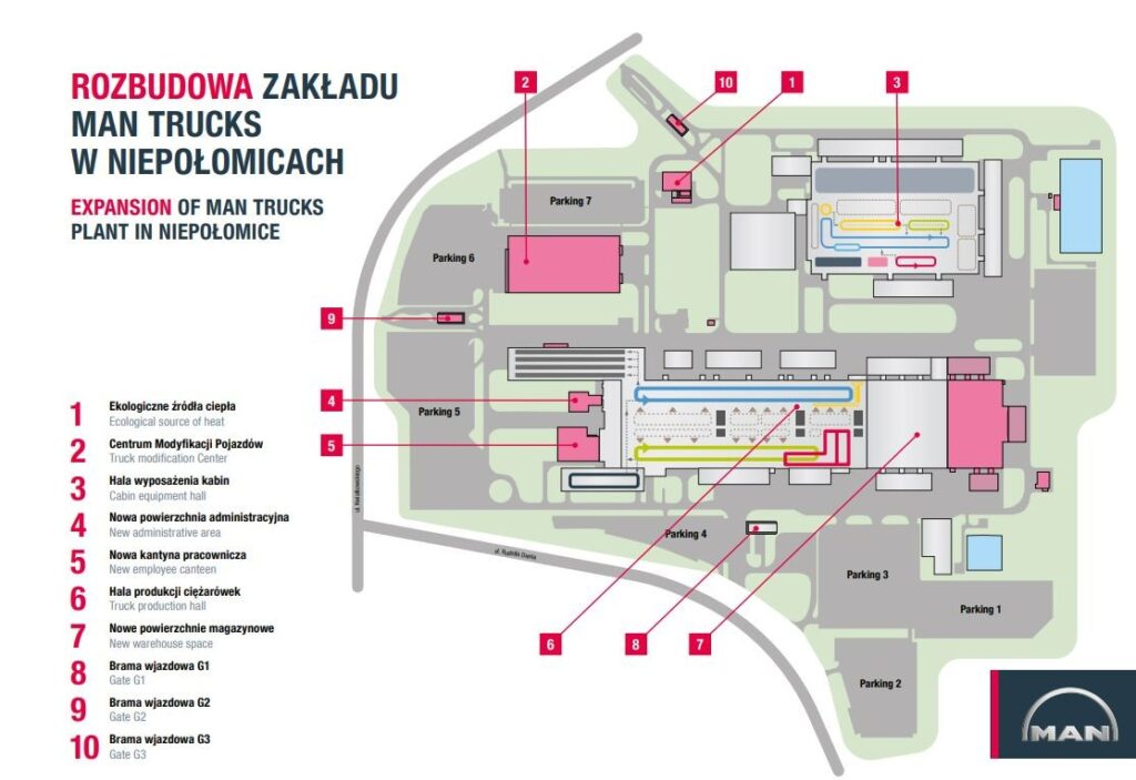 Nur 16 Monate nach der Grundsteinlegung hat MAN die Erweiterung seines Werks in Krakau erfolgreich abgeschlossen. Die Lkw-Produktion läuft im Dreischichtbetrieb und wird bis Endes des Jahres noch weiter hochgefahren. In den Ausbau des polnischen Produktionsstandorts investierte MAN rund 200 Millionen Euro. Das Werk wurde um etwa ein Drittel seiner Fläche vergrößert und umfasst nun 41 Hektar – so viel wie knapp 60 Fußballfelder. Zuvor wurden hier nur Lkw der schweren Reihe gefertigt, in Zukunft übernimmt der Standort auch die Umfänge der leichten und mittleren Reihen. Nach dem Umbau können in Krakau nun täglich etwa 300 Fahrzeuge und Fahrerhäuser im Dreischichtbetrieb vom Band laufen, was in etwa einer Verdreifachung der bisherigen Kapazität entspricht. Zudem wurde ein neues Pellet-Heizwerk errichtet, das seinen Beitrag zur geplanten CO2-Neutralität des Standorts leistet.