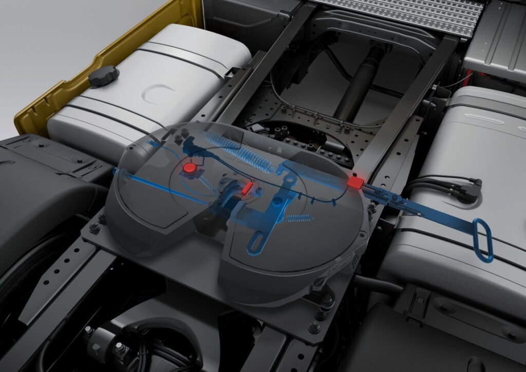 Eine weitere  wesentliche Entlastung für den Fahrer stellt die mit Sensoren ausgestattete Sattelkupplung dar. Ein Auflieger Sensor auf der Sattelplatte, ein Königszapfensensor am Kupplungsschloss und ein Verschlusssensor an der Zugriffssicherung überwachen den Aufsattelvorgang und stellen die  Informationen direkt über das digitale Anzeigeinstrument zur Verfügung. Der Fahrer hat so die korrekte Verriegelung der Sattelkupplung direkt von seinem Arbeitsplatz aus im Blick – eine enorme Erleichterung insbesondere bei Nacht und so ein weiterer Gewinn für  die Sicherheit.